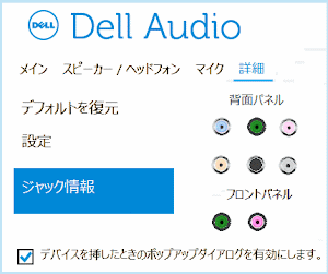 コントロールパネル>DELL Audio>詳細>ジャック情報 と進んでいくと左のような画面が出ます。